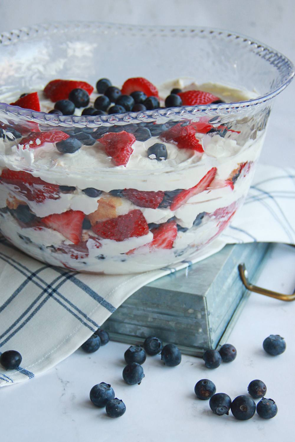 When it comes to dessert, cheesecake is my all time favorite! I don't have a huge sweet tooth but if there is cheesecake around, I can't resist. The only problem is cheesecake can be a little bit of a process to make and with the summer heat this time of the year, no one wants to be stuck in the hot kitchen baking. So for the upcoming 4th of July holiday, I will be once again making my cheesecake berry trifle. It combines the flavors of cheesecake, fresh summer berries, and angel food cake without any baking involved. It's light, fluffy, and perfectly red white and blue!